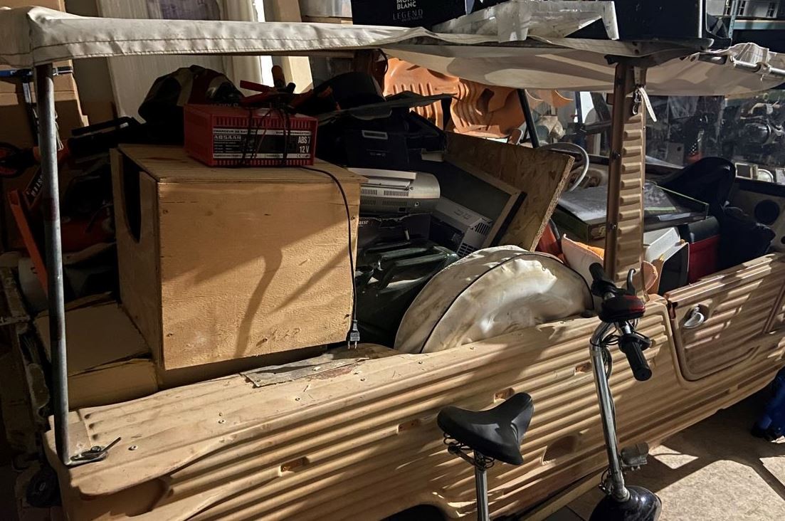 Enemble avec 50 ans de poussière, mais semble pas trop rouillé.. chassis accessible, essieux à démonter... Mehari garé à la verticale, inventaire des pièces à nettoyer, reviser, changer... Moteur AM2 à refaire pour remplacer celui présent.