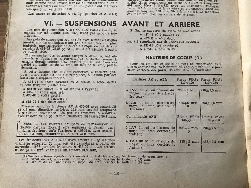 3)pour la hauteur de caisse, il me semble qu’il fut que la 2cv soit vide, avec une quantité d’essence (je ne sais plus) et une bonne pression des pneus.