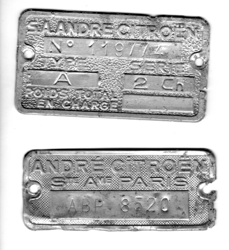 En haut la plaque avec le type et le numéro dans la série du type, ou numéro de châssis, ou numéro d'identification du véhicule, reporté en (E) sur la carte grise. Cette plaque est obligatoire. Le numéro doit être normalement frappé à froid sur le châssis de la 2 CV, sur la tôle du châssis à droite sous les pieds du passager. Il y a tolérance pour les voitures de plus de 30 ans, même en carte grise normale, je crois (à vérifier auprès d'un CT)