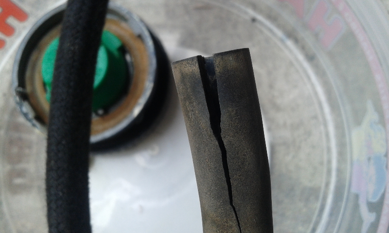 Durite poreuse et craquée. Certainement enlevée avec vibrations de la route.