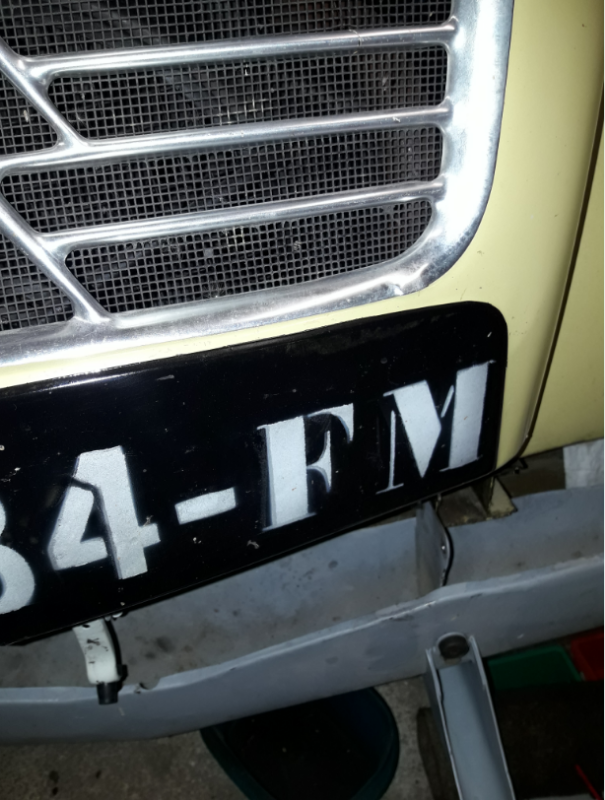 Pour essayer d’être un peu plus en conformité avec la loi :cul: , je comptais fabriquer une plaque minéralogique au forme de celle qui est en emboutie sur le capot de la Panama et à l'arrière de faire le même genre en deux parties . je suppose qu'a l'époque le lettrage était peint :???: . quoi que en 61 il y avait déjà des plaques . Sur le capot et sur les deux plaques minéralogique arrière il n'y a aucun trous je suppose donc que depuis 58 ans le lettrage a été peint au fil de ses immatriculations , ou alors les trous ont été bouchés ce qui m’étonnerais beaucoup , pas de trace de soudure sur l’arrière des tôles .