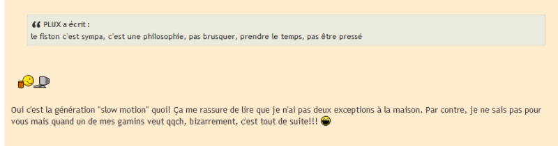 PLUX a écrit :le fiston c'est sympa, c'est une philosophie, pas brusquer, prendre le temps, pas être pressé
