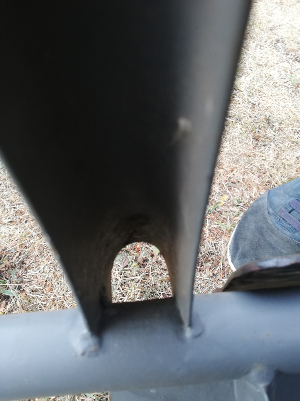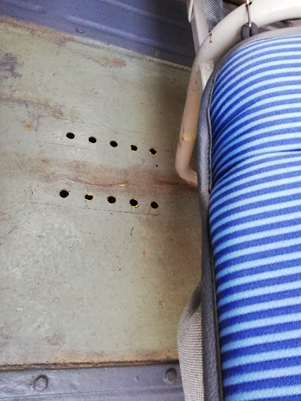 Comme c'est un châssis de fourgonnette, il est prévu pour des sièges séparés, et les trous que tu montres c'est pour la fixation des sièges. ce sont des trous dans la tôle supérieure du châssis, donc c'est normal de ne pas voir le jour à travers, sinon ça voudrait dire que ton châssis est percé en dessous