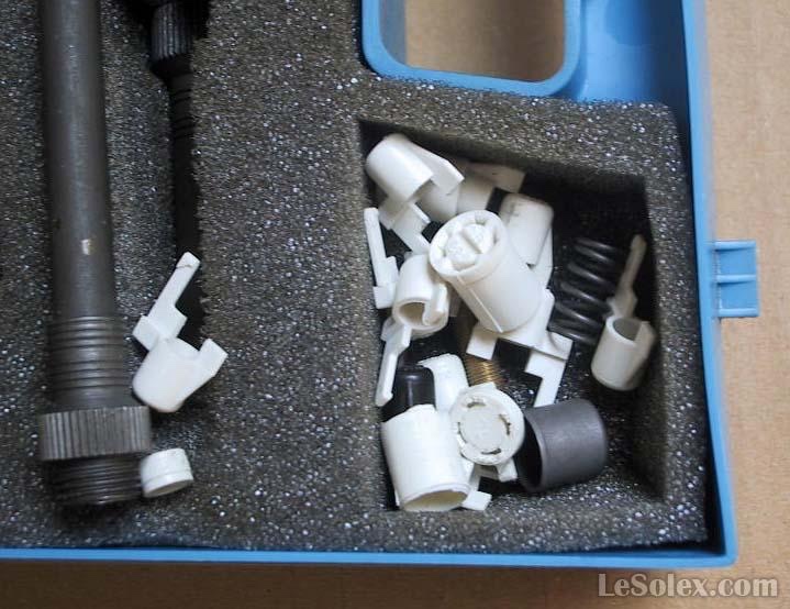 Quant au cache noir dessus, il est strictement inutile car c'est un témoin d'inviolabilité, posé à l'usine (Carbu Solex en noir et Weber en blanc). En cas de nouveau réglage, ce témoin casse et il faut le remplacer par un témoin Réparation (blanc chez Solex, noir chez Weber) avec un pistolet (coffret Solex 4035-T).