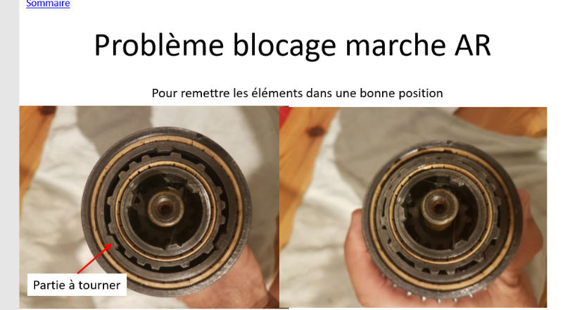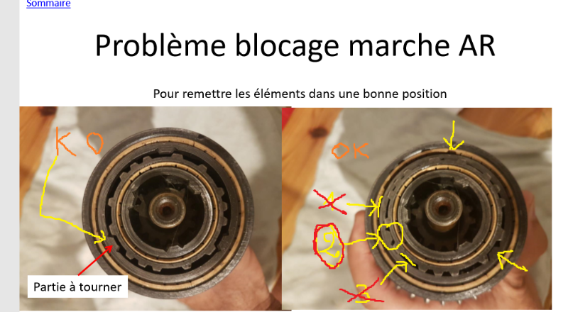 On ne peut pas bien voir si le synchro dont je t'ai parlé est correctement placé, il faudrait démonter l'ensemble...mais peut être que toi sur place tu as une meilleure vision de l'ensemble...