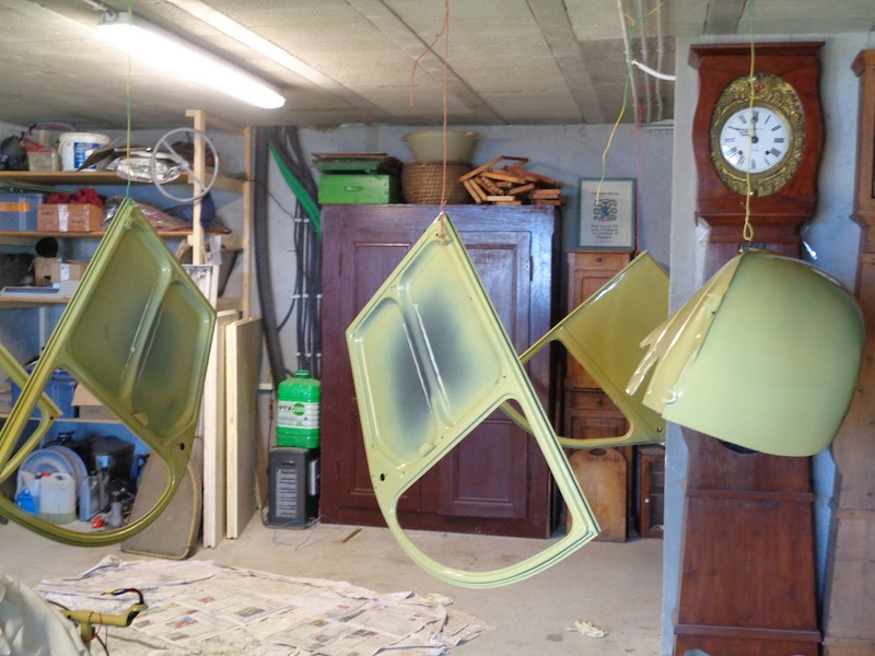 Voilà une 2cv bien désossée :) . Ici, décapage de toutes les parties de la carrosserie à la brosse rotative sur disqueuse à faible vitesse, puis ponçage au P240 à sec, puis au P400 à l'eau, puis mastic de remplissage, ponçage, mastic fin, ponçage au P400 puis P800 à l'eau du mastic, et ponçage au P1000 à l'eau: