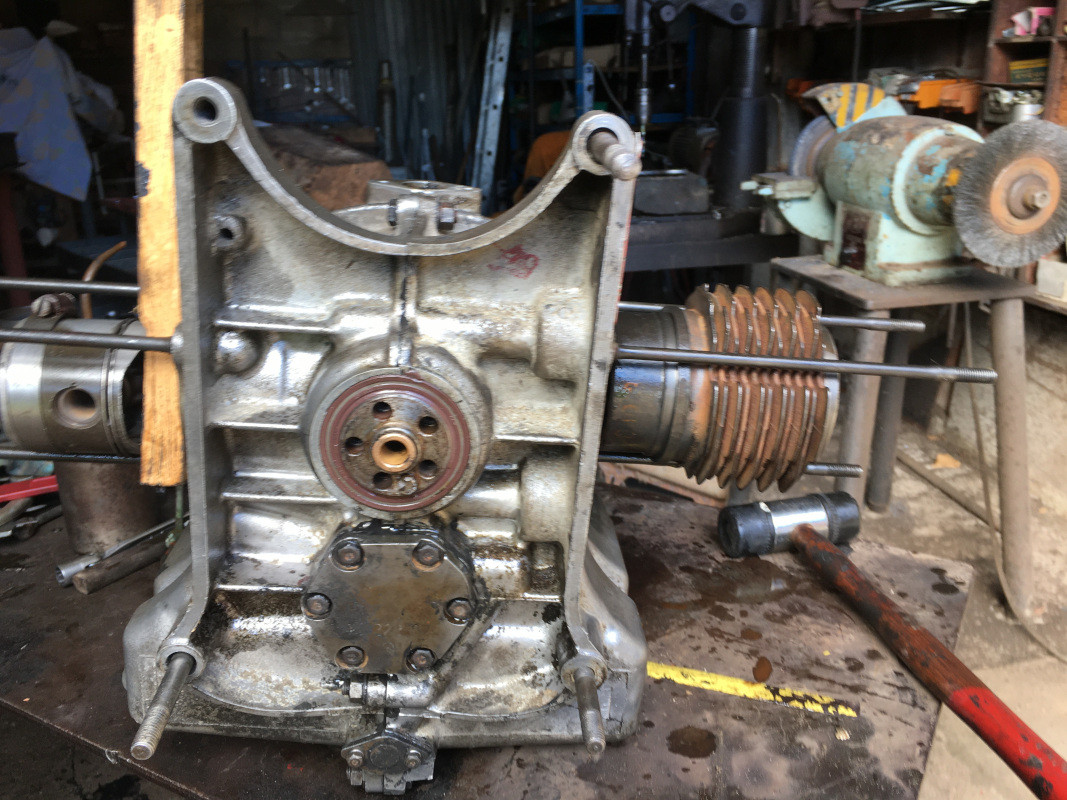 Ce matin, j'ai vidangé et nettoyé l'extérieur de la boite de vitesses. Elle contenait de l'huile (bien sale, mais il y en avait !) J'ai assemblé le moteur avec la boîte de vitesses "à blanc", pour pouvoir monter un démarreur et faire tourner le moteur pour contrôler la pression d'huile... Enfin, s'il n'y avait pas de (grosses) fuites, et l'huile montait aux culbuteurs..