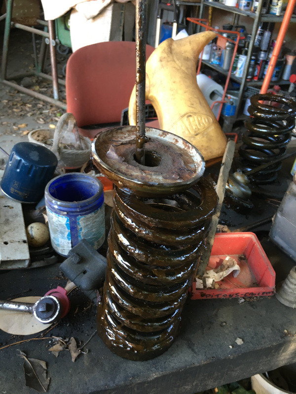 J'ai aussi dessoudé le couvercle d'un pot de suspension pour inspecter l'intérieur. Les coupelles et les ressorts baignaient dans la graisse, tout ce beau monde semble en bon état.
