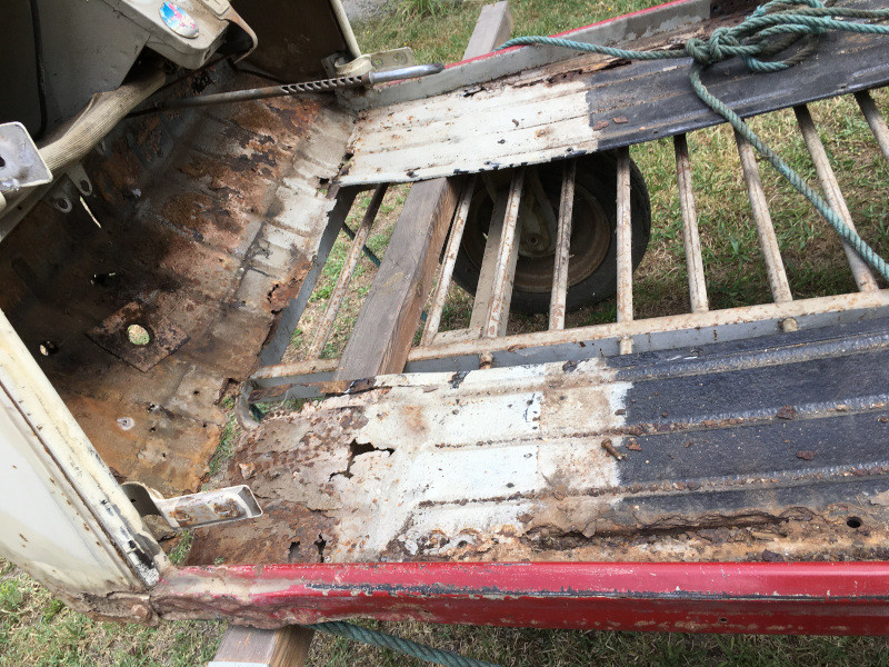 J'ai donc enlevé les ouvrants (portes, capot, couvercle de malle, capote, sièges..), puis dérivé les tôles, sur-tôles et autres rapiéçages posés au fil des ans...
