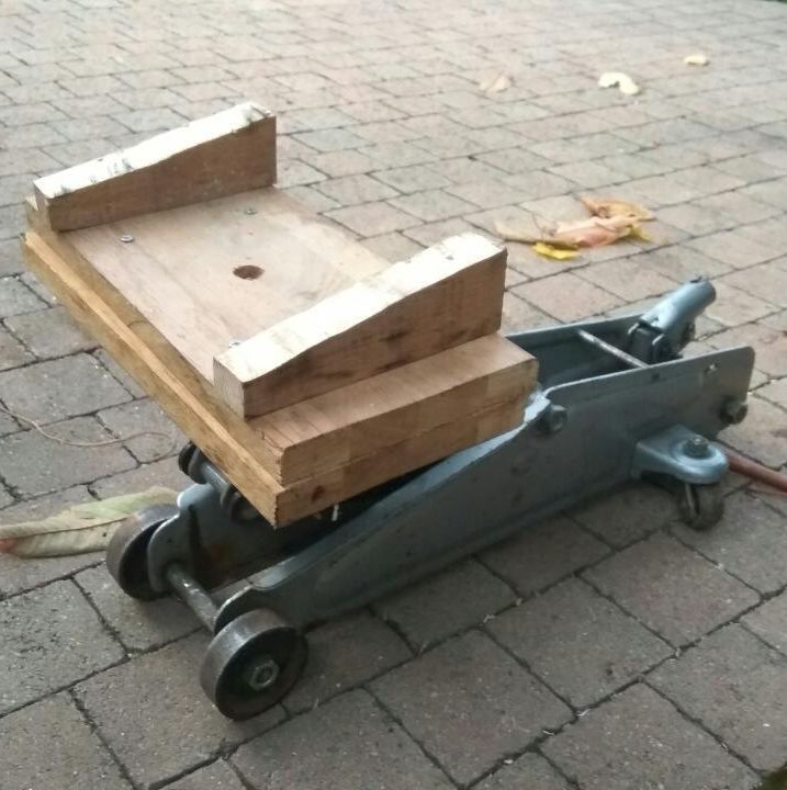 le kit LUK monte bien, pour m'aider à installer le moteur j'ai bidouillé le cric rouleur avec une platine en bois me permettant de guider d'une main et soutenir de l'autre