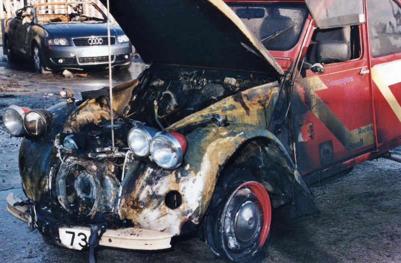 I was driving home from work one evening, and the Petrol delivery pipe up to the Carburetor, slipped of its mounting and pumped fuel onto a red hot manifold, the underside of my Bonnet was lined with 2 inch thick noise eliminating Wadding, which caught fire instantly... in 6 seconds of braking and jumping out the Car to save my Life... she was gone.... before you ask..... Oh Yes I had a Commercial Heavy duty extinguisher under the passenger seat... it was a senario of Run for your Life.