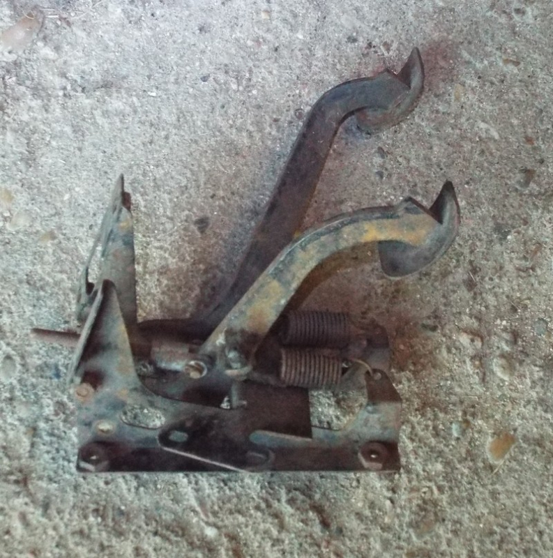 Si tu as une 2 CV 4 ou ne 2 CV Spécial avec carbu simple corps et donc une pédale palette, regarde bien ton pédalier, il devrait avoir le trou pour fixer la pédale d'accélérateur. Il n'y avait qu'une seule fabrication et avec le trou. Après on montait ou non la pédale.