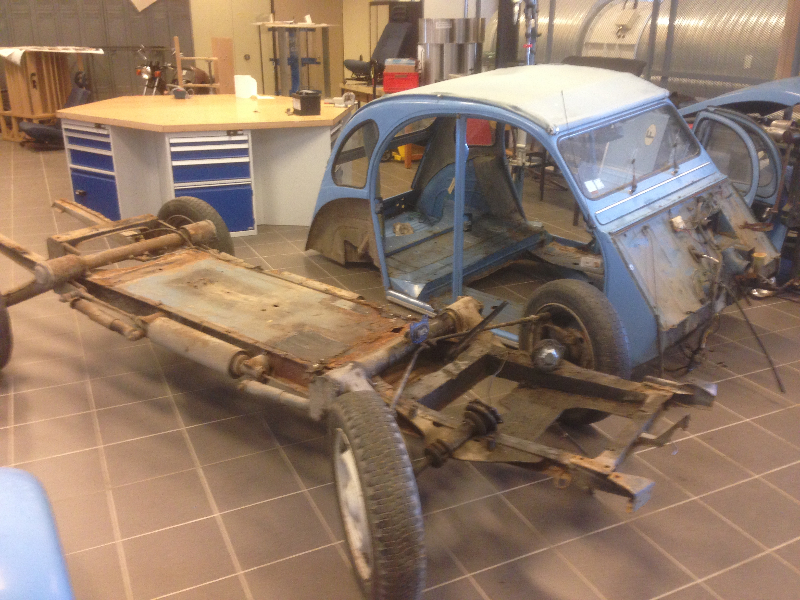 J'ai commencé la restauration d'une 2 Cvs 6 où disons plutôt d'une 2 Cvs 4 équipée d'un moteur de 2 Cv6 ce serait plus juste. Concernant ces deux types de 2 Cv4 et 2 Cv6 les châssis sont ils identiques ? Pour l'instant j'ai décoqué et enlevé le moteur, le châssis est à changer ce qui était attendu. j'entends parler de châssis homologués ou d'autres qui ne le seraient pas, de châssis galvanisés ou d'autres en acier noir ( E24) recouvert d'un revêtement anti corrosion. Quelqu'un aurait il des références ? Ou des indications pour m'aider à faire ce choix, galvanisé me parait pas mal mais si après ça pose des soucis pour le soudage..Deuxième point, bien évidemment les planchers latéraux et avant sont à changer ce qui était attendu aussi. J'entends parler de gens qui découpent, d'autres qui dé soudent ( ? ) pour enlever les vieux planchers. Y at-il une méthode ? Y a t-il des pattes ou des points de positionnement sur la coque qu'il faut récupérer afin de positionner le nouveau plancher notamment à le plancher avant ? Je pense qu'en découpant on risque de les perdre mais bon...Pour les planchers latéraux le plus simple n'est il pas de changer aussi les brancards donc les traverses sous les portes ? Merci beaucoup et à bientôt