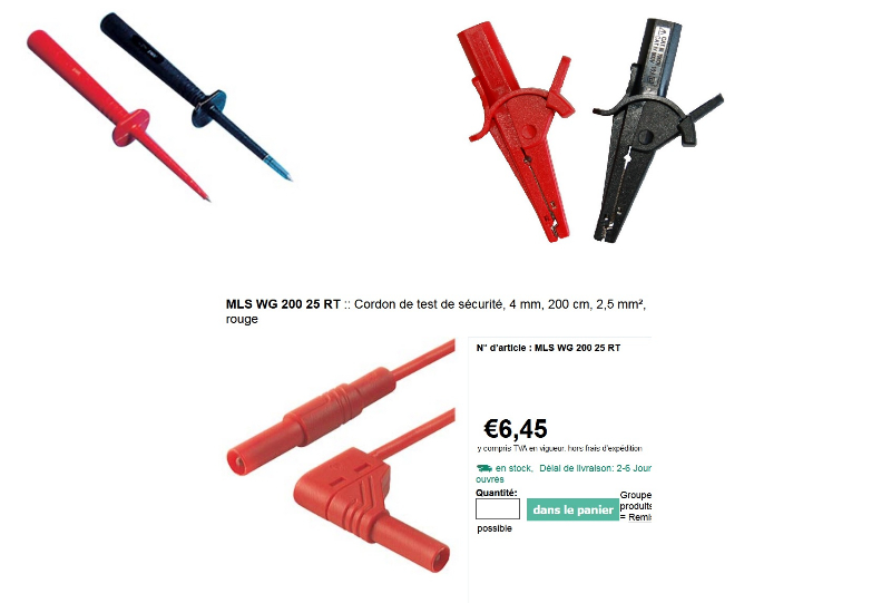 et pour les apprentis electriciens je vous conseille d'investir dans un minimun de matos , pince croco , cordon fiche bananes de 2M et pointe de touche fine pour eviter de faire des court circuit lors de mesures acrobatiques.