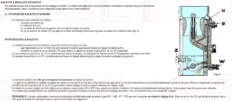 Il y a une vis de richesse et la butée du papillon premier corps. Faut juste ouvrir le papillon en vissant sa vis de butée, puis régler la vis de richesse pour avoir la vitesse la plus rapide, puis on déserre un poil la vis de butée, on recommence avec la vis de richesse, etc...