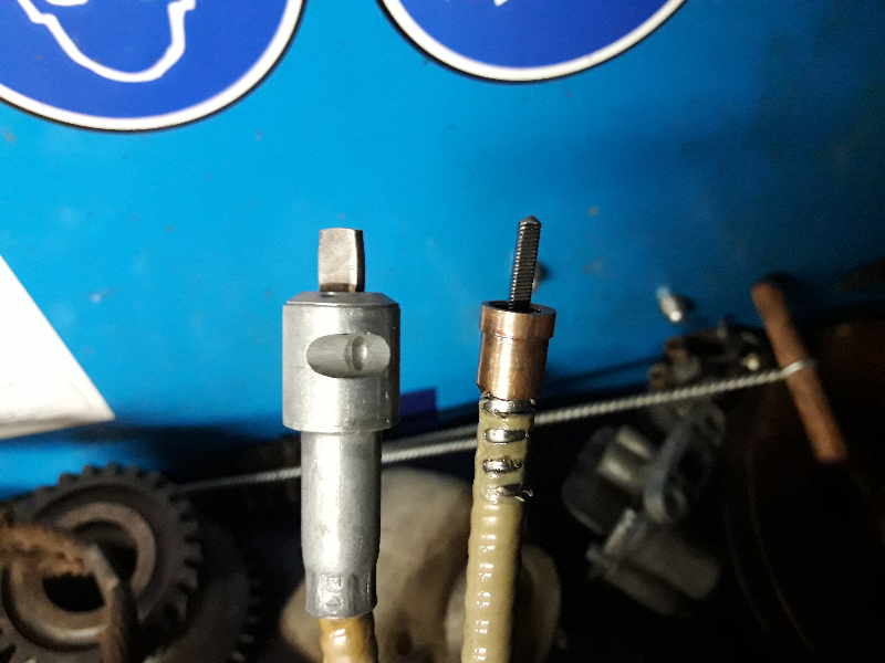 Aujourd'hui j'ai remis en état la gaine du câble de compteur ou plutôt la bague en laiton coté compteur qui était complétement usée et ou le sertissage avait disparu au fil du temps , du coup plus rien ne fonctionnait . J'ai donc récupérè un morceau de tube du même diamètre et de 25 m/m de longueur ( plus long que l'origine se que me permettra de faire le sertissage ) J'ai ensuite chargé à la brasure pour refaire l'épaulement ( facile a travailler avec la perceuse à colonne et une lime ) Le sertissage se fait avec une pince à cosses ( faire le serrage dans l’étau , sans écraser le câble dans la gaine ressort ) L'ensemble une fois serti ( ne pas oublier de passer l’écrou de serrage avant de faire le sertissage ) Avant le remontage nettoyer l'intérieur de compteur et remettre de la graisse à roulement . Et voila le compteur remonté c'est reparti pour 60 piges