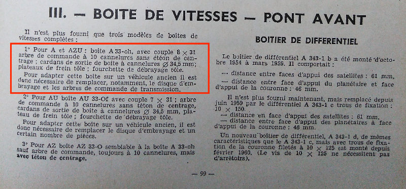 Je vous mets en pièces jointes ce que j'ai trouvé dans la RTA, et précisément un paragraphe, qui, si j'ai bien compris, indique qu'entre 1956 et 1960 me semble t'il, les boite de A et AZU étaient les mêmes. La RTA indique aussi que pour l'adapter sur un moteur ancien (donc de A de 52 pour mon cas), il faut changer le disque d'embrayage et l'arbre de commande