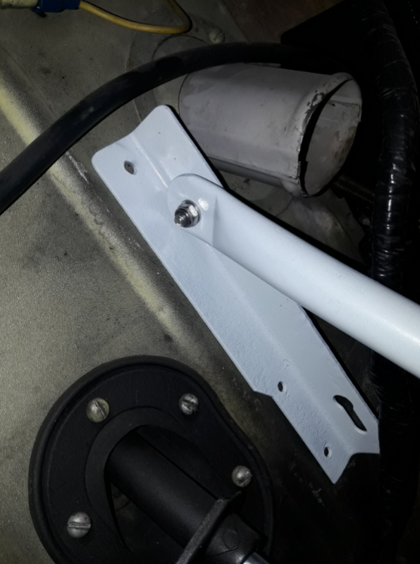La photo du support existe en début de topic envoyée par Bob : Le support comme je te le disais est fixé sur deux écrous qui maintiennent le levier de vitesse, c'est pour cette raison que la cornière de gauche ne se trouve pas à la même hauteur que la cornière de droite ---> 2cms d'écart ... et que la patte est un peu décalée vers la gauche et pas au dessus de la potence verticale (à mon avis :???: )