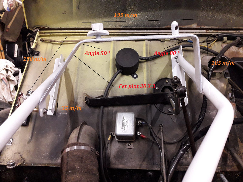 Tant que j'y suis, quelle est l'épaisseur du fer plat support de roue, sa longueur totale et les cotes détaillées entre les plis et à quelle distance se trouve t'il du bout écrasé du levier et quel est le diamètre de la béquille ?