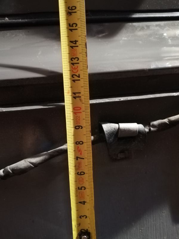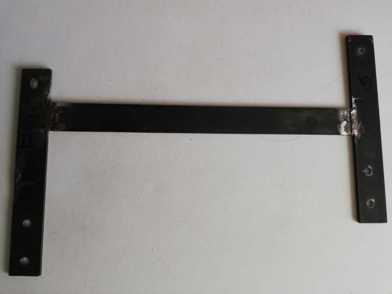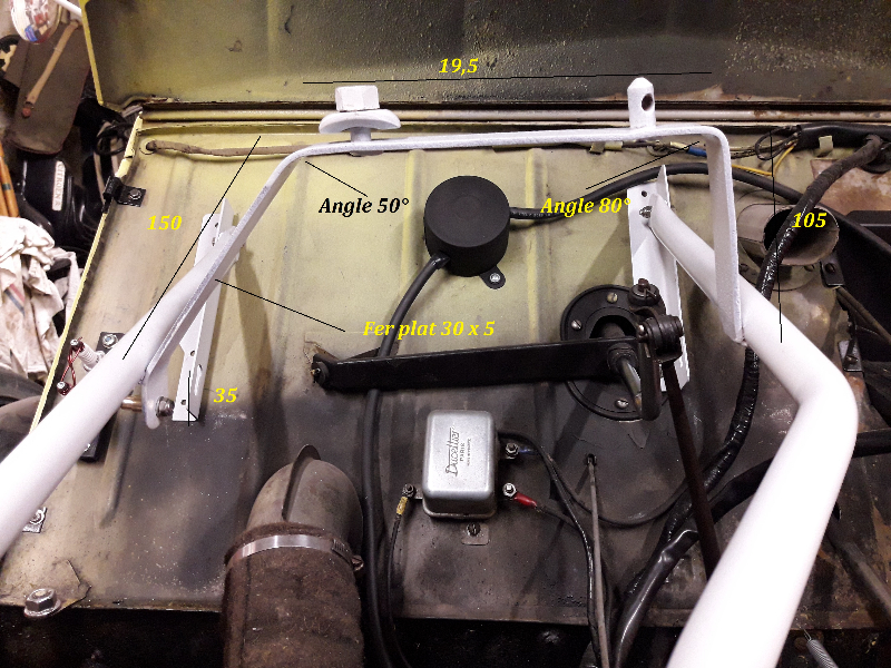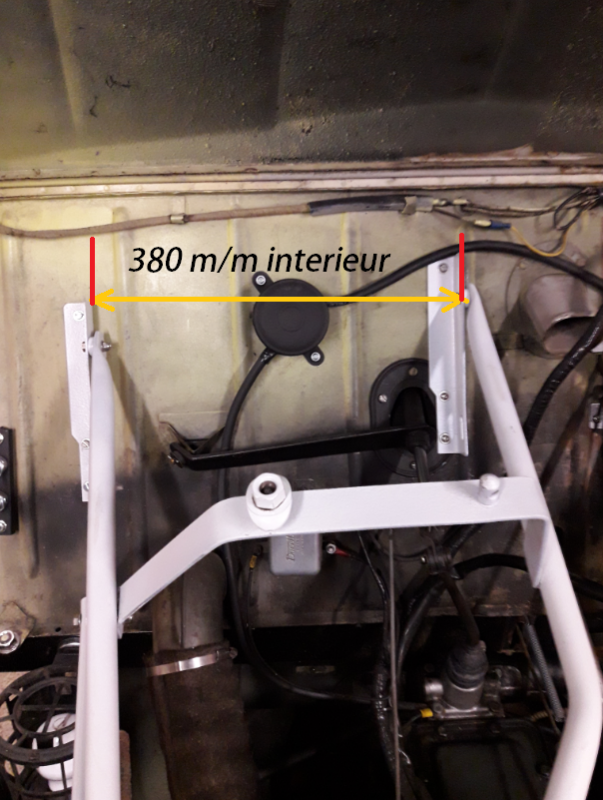 Ça y est ! j'ai fait mes rectifications de cotes , dessoudé, ressoudé, refait une équerre plus étroite (30 mm au lieu de 35 mm). Je pense que maintenant c'est ok, j'ai mis 350 mm entre les deux barres et les équerres tombent bien parallèles aux bossages du tablier. Je dois juste m'assurer de la hauteur des équerres pour que la roue en place ne frotte pas trop le capot car moi j'ai 1,5 cm d'insonorisant collé dessous.