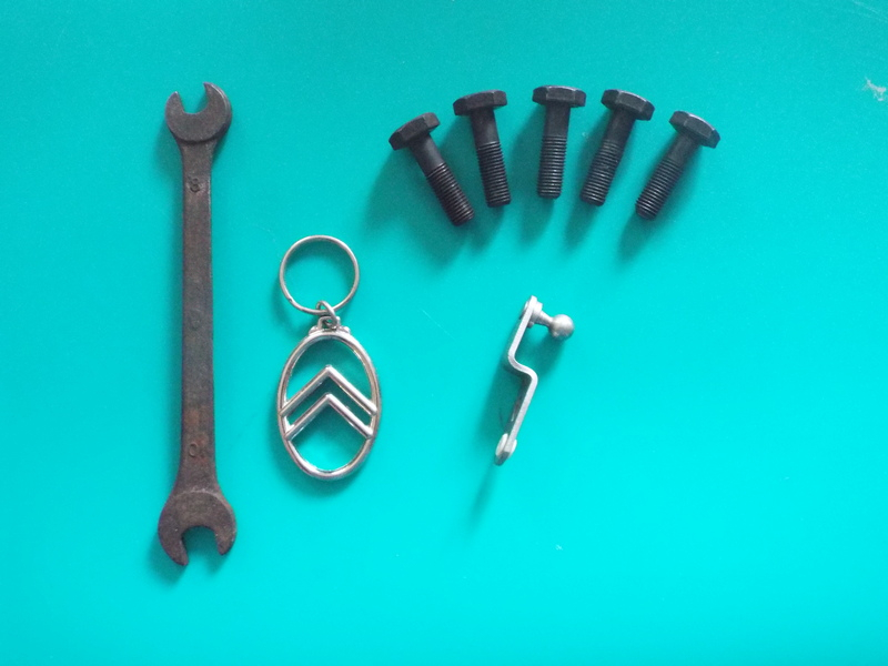 Et quelques emplettes : une clé 8x10 SER d'outillage de 2 CV, 5 vis de volant moteur neuves (il n'y en a plus chez les marchands), un porte clé chevrons moderne mais je trouve sympa pour ma A, et un levier de carbu avec rotule pour Math. Il devra juste dessertir la rotule, la retourner et y mettre un point de soudure car il est à l'envers pour le 22 ZACI de sa A, mais je n'en ai pas trouvé d'autre !