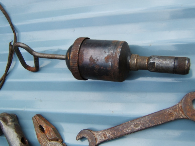 L'outil à droite c'est une pompe à graisse qui était fournie dans la trousse à outils. D'ailleurs, c'est le seul outil d'origine qui me manque pour le moment. Si quelqu'un en a une Elle est de marque Técalémit.