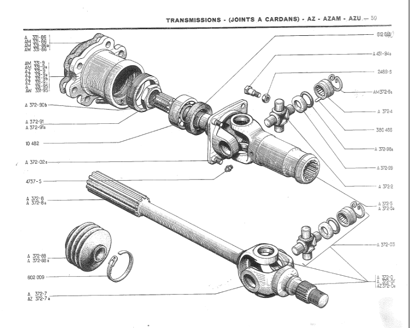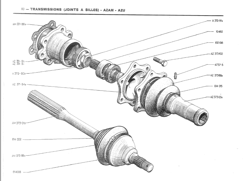Après je pense qu'il faut que tu nous montres une photo de tes cardans car il y en a eu plusieurs modèles en fonction des années ...Par exemple , j'ai une AZAM de fin 66 montée avec des joints homocinétiques à billes mais je ne suis pas certain que pour ton Azam c'était monté ainsi...
