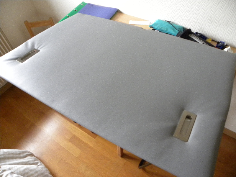 Je voulais juste vous faire partager mon installation que je me suis faite pour mon fond de coffre...habillage en skai gris, sur doufline, un bout de rail, quelques vis et pour insoler le dessous du bruit, de l'isolant parquet