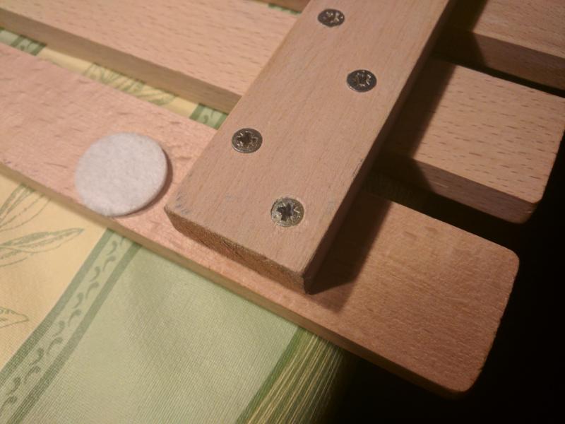 Détail de l'angle vu de dessous, avec l'équerre métallique, le taquet et le patin.
