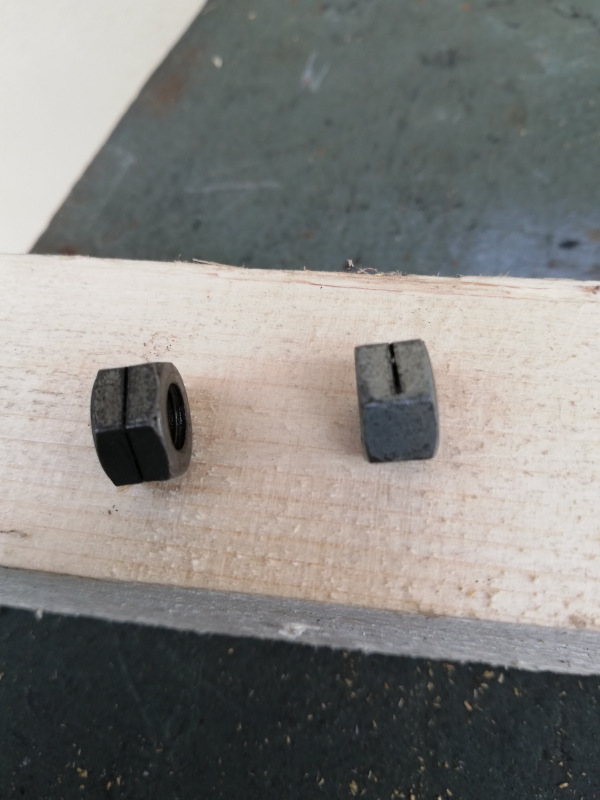 je pense cette fente sur les écrous et surement pour passer un petit morceaux de fil de fer une fois serrer et relier les deux ensemble pour pas qu'il se desserre