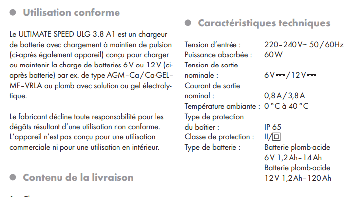 Soit, il fait les deux, charge et maintien mais perso, je n'en suis pas satisfait. Il est peut être parfait pour du 12 volts mais cet appareil est prévu pour des batterie de 14 AmpH pour le 6 volts , pour des motos donc ? C'est écrit sur la notice, voir ci dessous :