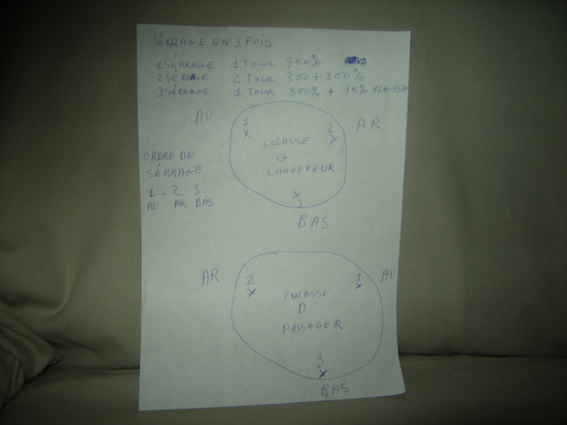 tu commence dans l'ordre de serrage toujours, boulon AV n 1 AR n 2 et BAS n 3 comme sur le dessin. Tu mais ta clé a 12h un tour complet 360%.