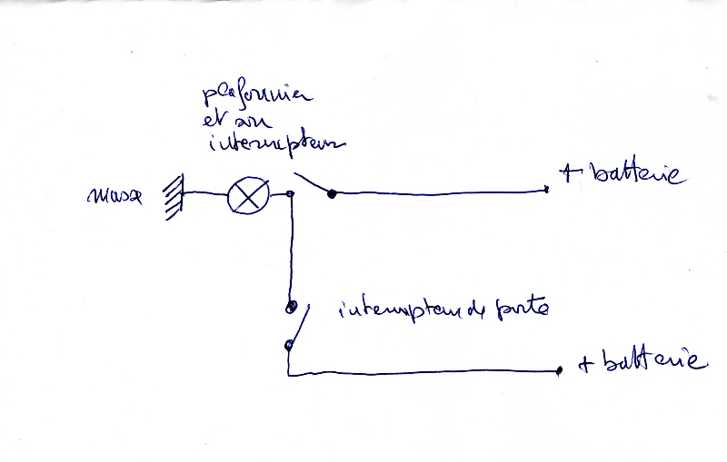 Regarde mon schéma : le fil qui vient directement du plus batterie (sans passer par ton interrupteur de porte) ne doit pas être branché directement sur la lampe mais sur le plot AVANT l'interrupteur du plafonnier.