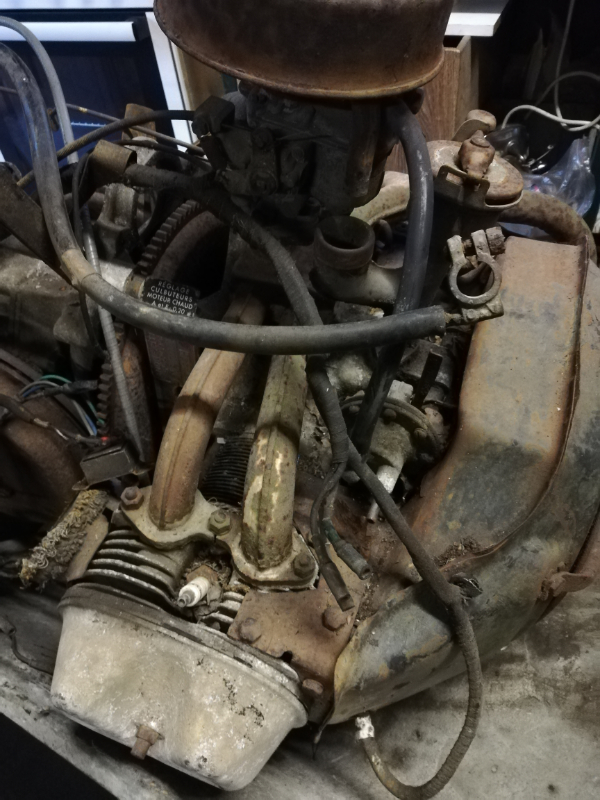La chance m'a sourit aujourd’hui , j'ai trouvé un moteur/boite complet , je pense que c'est un 425 /12 cv . Il est noté AZ sur la plaque moteur et ressemble à celui que je me proposais de restaurer. Mais, les cylindres sont différents. Le carburateur est un 26 BCI... 6 pales au ventilateur encore rempli de glands...
