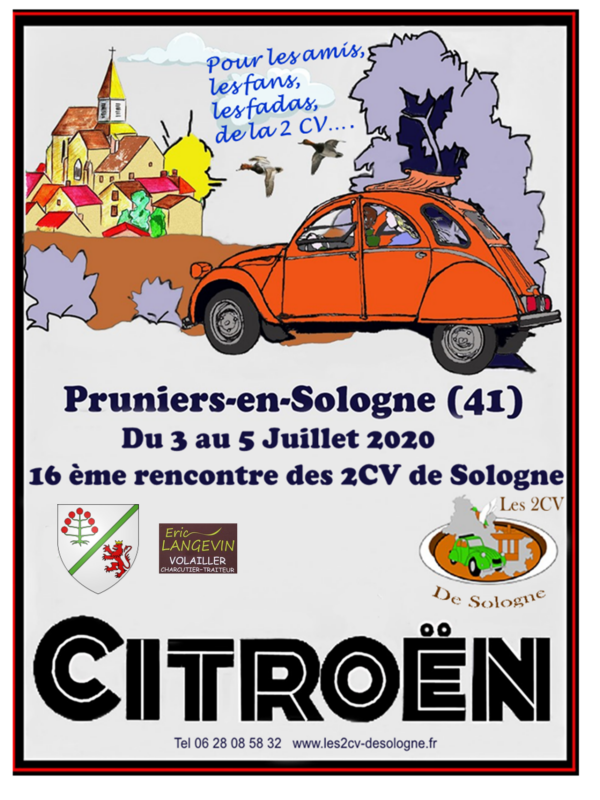 Comme je sais que vous êtes tous en train de préparer votre agenda pour 2020, et que pour certains je suis sur qu'il est déjà bien rempli, je vous invite dès maintenant à participer à notre rencontre 2 CV en Sologne, du 3 au 5 juillet à Pruniers-en-Sologne dans le Loir-et-Cher. Très beau terrain ombragé avec un étang.