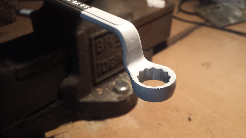 J’ai donc modifié à cet effet deux clés coudées à œil à 12 crans, respectivement de 24mm et 14 mm (photo).