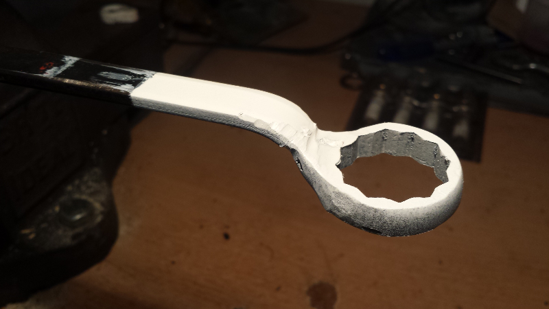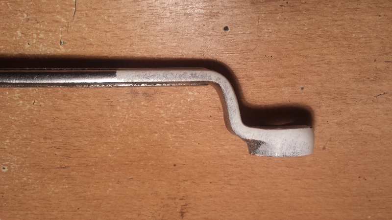 Clé de 14mm pour le verrouillage des excentriques : j’ai bien chauffé la clé au chalumeau puis je l’ai pliée pour augmenter le déport vertical (photo)