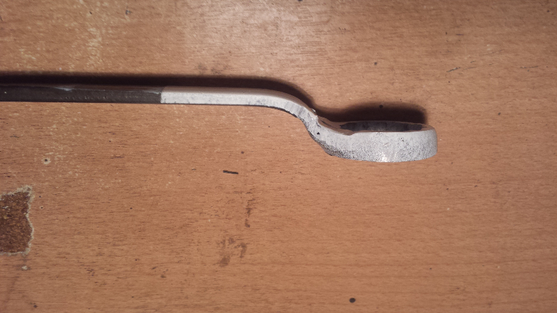 Clé de 24mm pour le réglage des excentriques: j’ai découpé l’œil à la meuleuse d’angle, puis j’ai réduit son « épaisseur » de moitié. J’ai ensuite soudé au MIG un élément métallique étroit légèrement déporté en guise de poignée (photo).