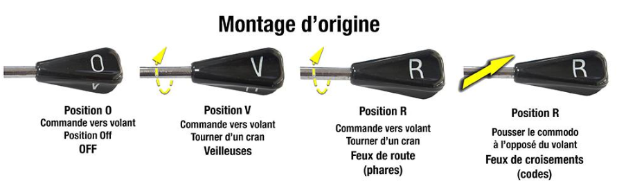 Ainsi sur un fonctionnement de ville, on peut se mettre sur V et alterner veilleuses/croisement ; et en route on peut se mettre sur R et alterner phares/croisement Il semble exister un montage modifié, et qui est plus similaire de nos voitures actuelles fait que si on tourne le comodo on suit la séquence OFF -> veilleuses -> croisement :