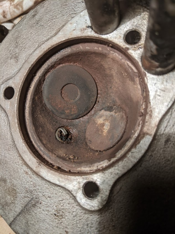 la plus abîmée : Pour le coup la photo n'amplifie pas les défauts ! le siège d'échappement notamment est assez profondément marqué et je ne suis pas certain que ça soit rectifiable sans changement du siège, et là ça chiffre tout de suite plus ! Juste le changement d'un siège et les 4 soupapes neuves, j'en ai pour le prix de 2 culasses d'occasion en bon état, ne nécessitant qu'un rodage et un changement de guide à tout casser.