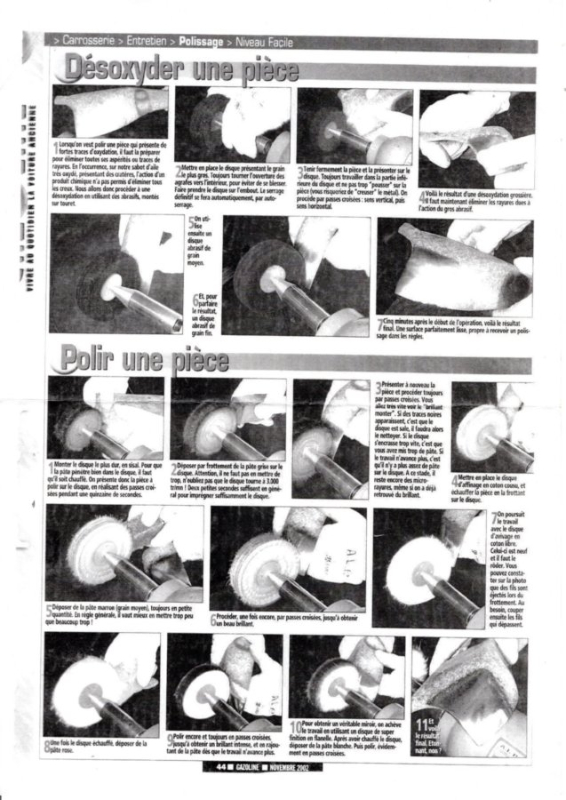 Bob a écrit : Il m'a été livré avec un mode d'emploi détaillée : type de brosse, vitesse de rotation, température, etc. et un article fort documenté de "La Vie de l'Auto" sur le sujet.