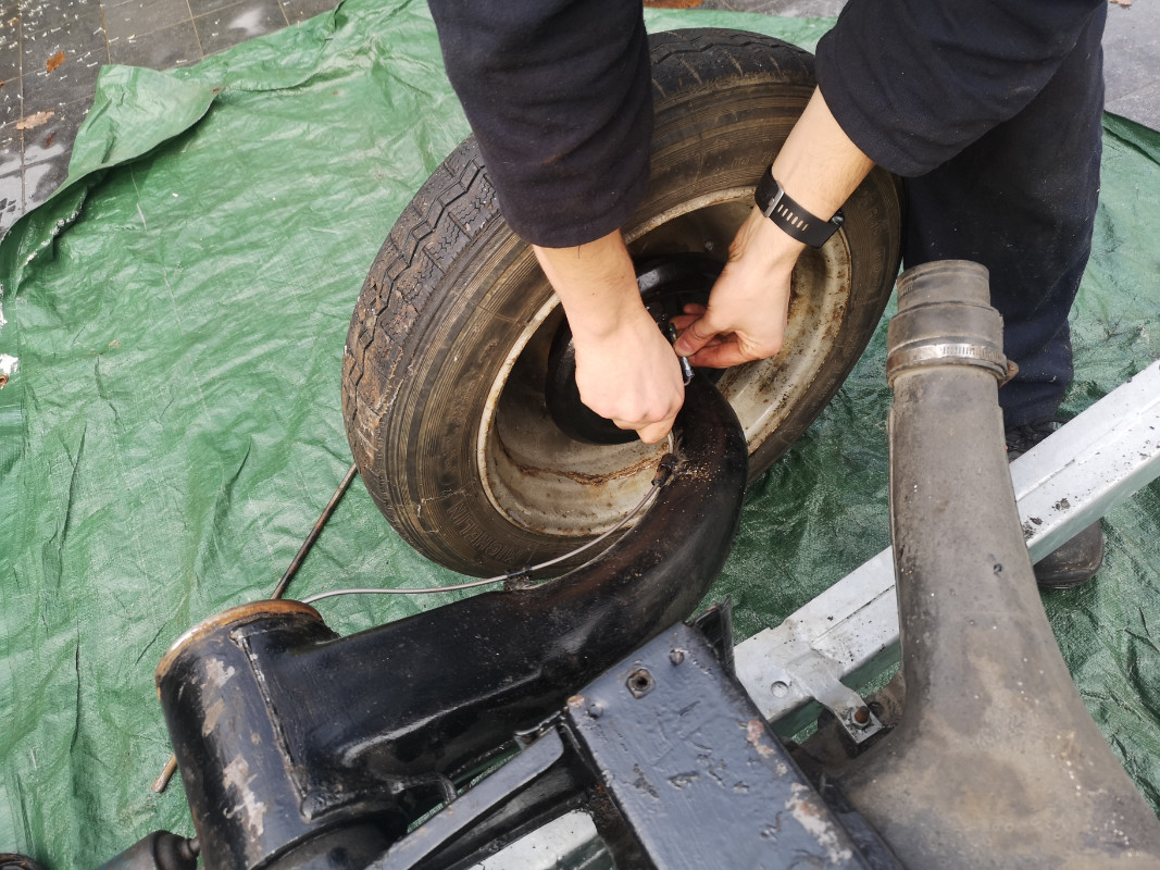 On fait sauter le matage et l'écrou de 44 avec la douille kivabien et une allonge de 2m... Pendant un moment, j'ai hésité à utiliser la méthode de la jante avec écrou pour faire décoller le tambour... J'ai finalement investi dans l'outil ad hoc, 22€ chez Cipere