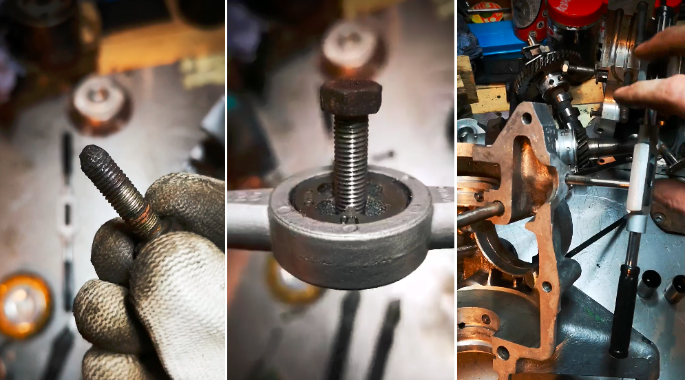 Pour le lève soupape, si tu sais souder, tu peux t'en sortir facilement avec un serre joint avec des becs de serrage assez grand (15 cms environ).Comme constant j'ai utilisé un serre joint mais moi j'ai soudé un bout de fer carré que j'ai ouvert sur deux côté pour pouvoir récupérer les clavettes des soupapes...