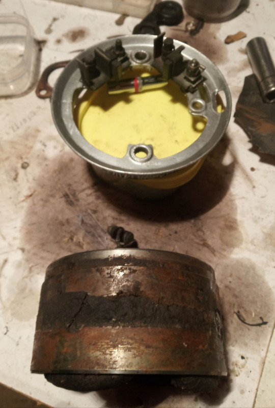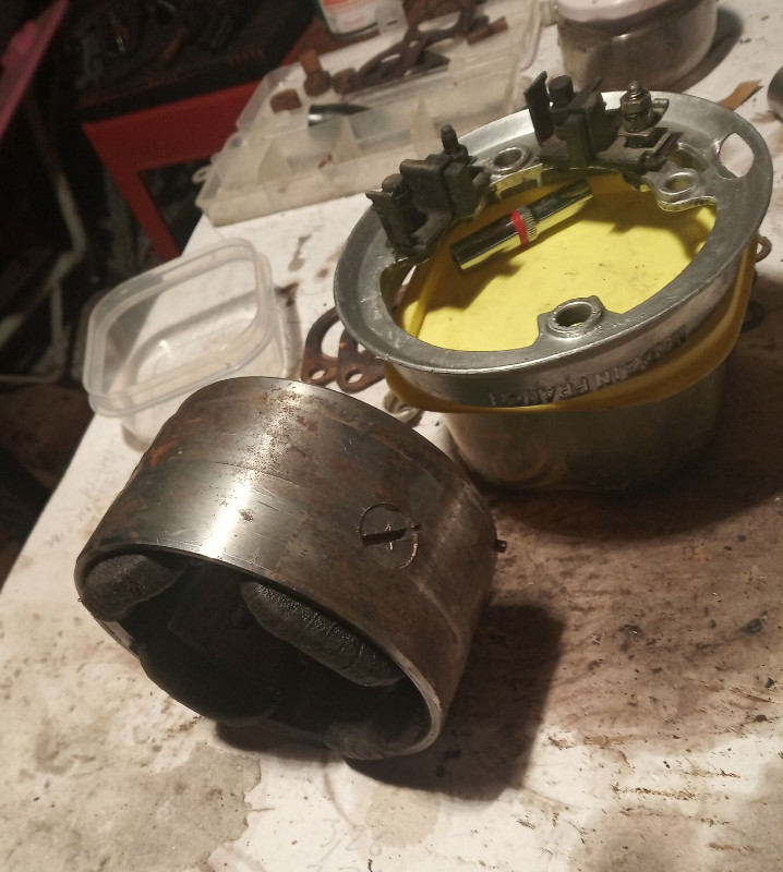 ensuite j'ai débarbouillé la dynamo, le tour porte-charbons ça allait à peu près, mais le stator lui avait une bonne épaisseur de cambouis.