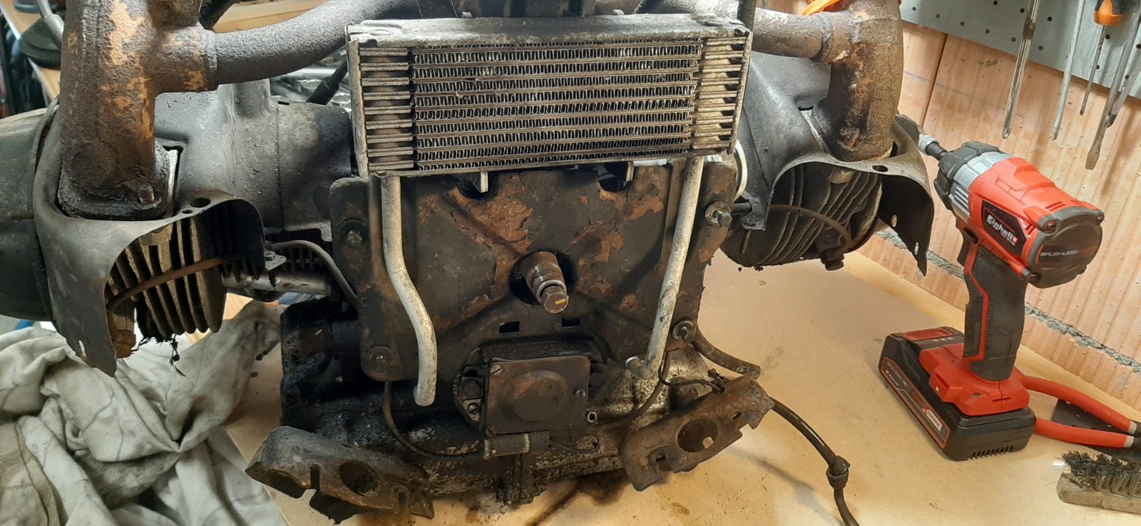 C'est donc une Méhari de 1973. Donc démontage de l'ensemble moteur/boite, qui avait grand besoin de nettoyage, pour commencer! Parce qu'il y'avait pas mal de monde dans tout ça, entre le sable (vis en bord d'ocean), insecte, paille, et plein d'huile pour tout coller! Donc j'ai attaqué le nettoyage, après avoir tout démonté. Moteur plutôt sain, mais les chemise marqué et fatigué.