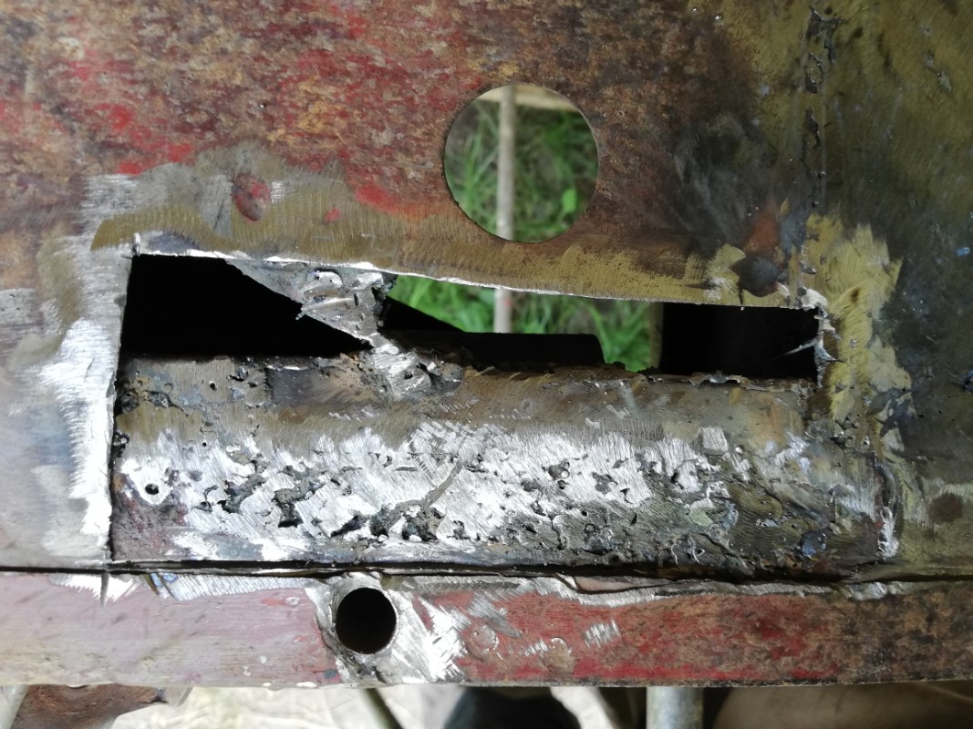 J'ai encore à m'occuper de la partie longeron ... il a souffert sur 10 cms de longueur , mais c'est rattrapable même si c'est une autre affaire car je vais devoir poser une tôle de 10/10 pour réparer le longeron puis souder une tôle de 8/10 par dessus !