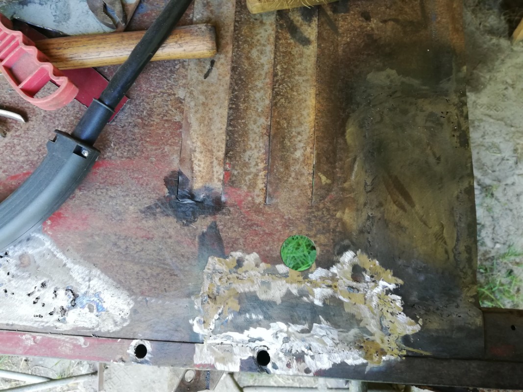 C'est sûr que si on ne m'avait pas donné cette AK, je ne crois pas que je me serais lancé dans sa restauration...Bon , pour le châssis c'est maintenant terminé...ce matin j'ai découpé le bout de tôle de remplacement et je l'ai soudé bord à bord en ayant pris soin de souder à la pointeuse deux bouts de tôle de 25 mm de large, sur tout la longueur (enfin pas tout à fait) de la tôle de remplacement, de chaque côté , pour réaliser une feuillure sur laquelle la soudure vient se poser, je ne perce pas la tôle de cette façon et ça me fait gagner du temps...même si j'en perd un peu pour découper et pointer ces feuillures...
