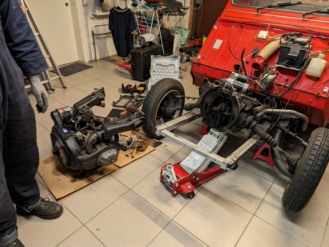 Tous les accessoires se démontent facilement... Plus qu'à enlever la bestiole! Elle résiste en plus! Une des piges de centrage moteur-boîte était grippée dans le carter du moteur et nous empêchait de le sortir. Un peu de "gauche-droite" ont permis de la décoller (et +- une bonbonne de WD-40). Le moteur est ensuite sorti facilement à deux!