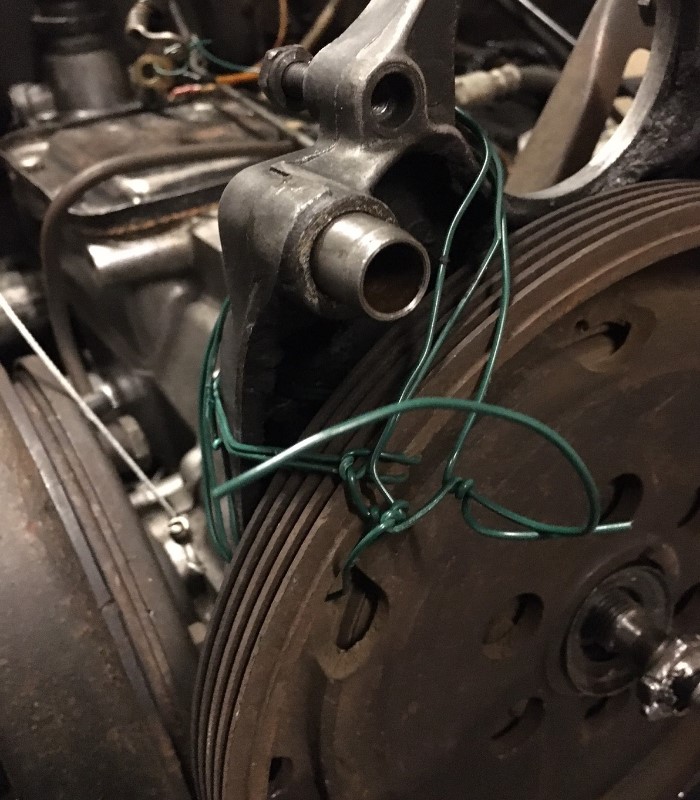 Blocage du plateau d'embrayage mobile avec du fil de fer, en passant une vitesse il y a quand même du jeu au niveau des pignons et je n'ai pas envie de provoquer des coups sur les pignons, c'est tout simple, mais très efficace :