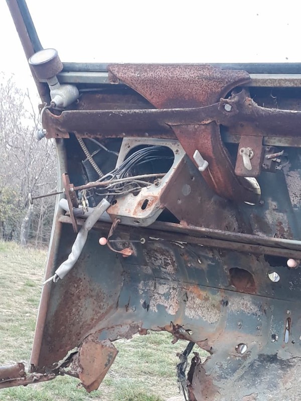 La rampe de phares est présente, sans bobine avec des cuvelages plastique et pas d'optiques, le régulateur manque à l'appel comme les pédales, toutes les tirettes chauffage, démarreur, starter, réglage des phares le levier de vitesse est plus que passable, le faisceau électrique n'existe pas, le volet sous le pare-brise non plus, pas de compteur ni de mécanisme d'essuie-glaces, j'en passe et des meilleures. Le "bon"côté, c'est qu'il y avait une CG de 66, c'est toujours ça de pris